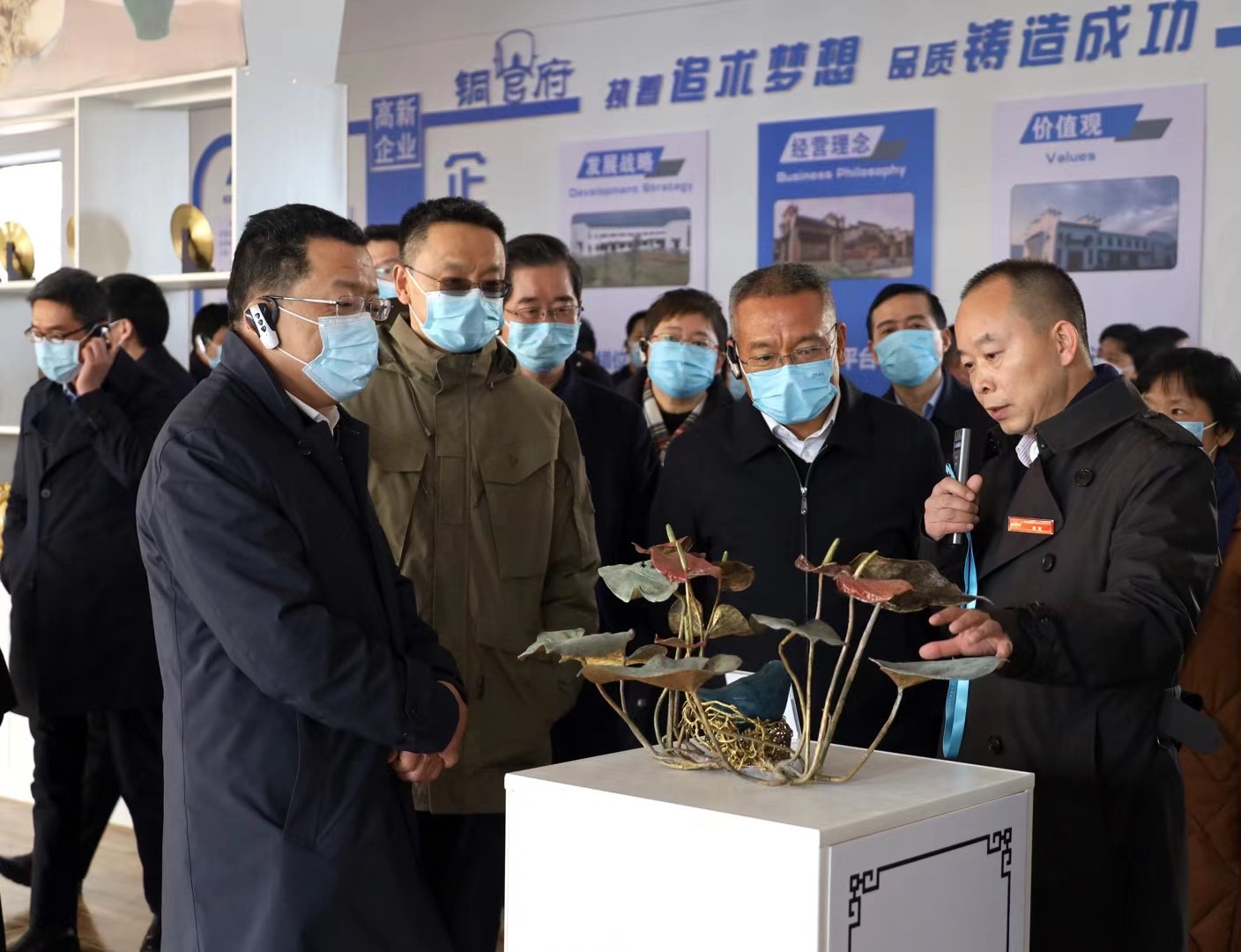 1月12日下午,中共銅陵市委十屆十四次全體(擴(kuò)大)會(huì)議期間,市委書記丁純,市委副書記、市長(zhǎng)胡啟生及各市直部門、開發(fā)園區(qū)和縣區(qū)主要負(fù)責(zé)人等近百人,現(xiàn)場(chǎng)觀摩銅官府銅藝產(chǎn)業(yè)園。全體委員還集中參觀了全國景泰藍(lán)職業(yè)技能競(jìng)賽參加決賽選手作品以及趙敏的寫真銅藝作品等。