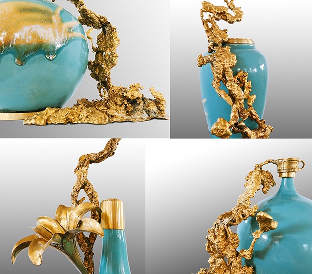 首先給彩瓷加了一個銅底座、銅沿口,然后把熔化后的銅水倒進沙里,形成不同自然形狀后再與彩瓷底座和沿口相連,效果出人意料的好,厚重與輕脆相融,古樸與現(xiàn)代結合,也不知是瓷攀上了銅,還是銅纏上了瓷。相得益彰,妙不可言。