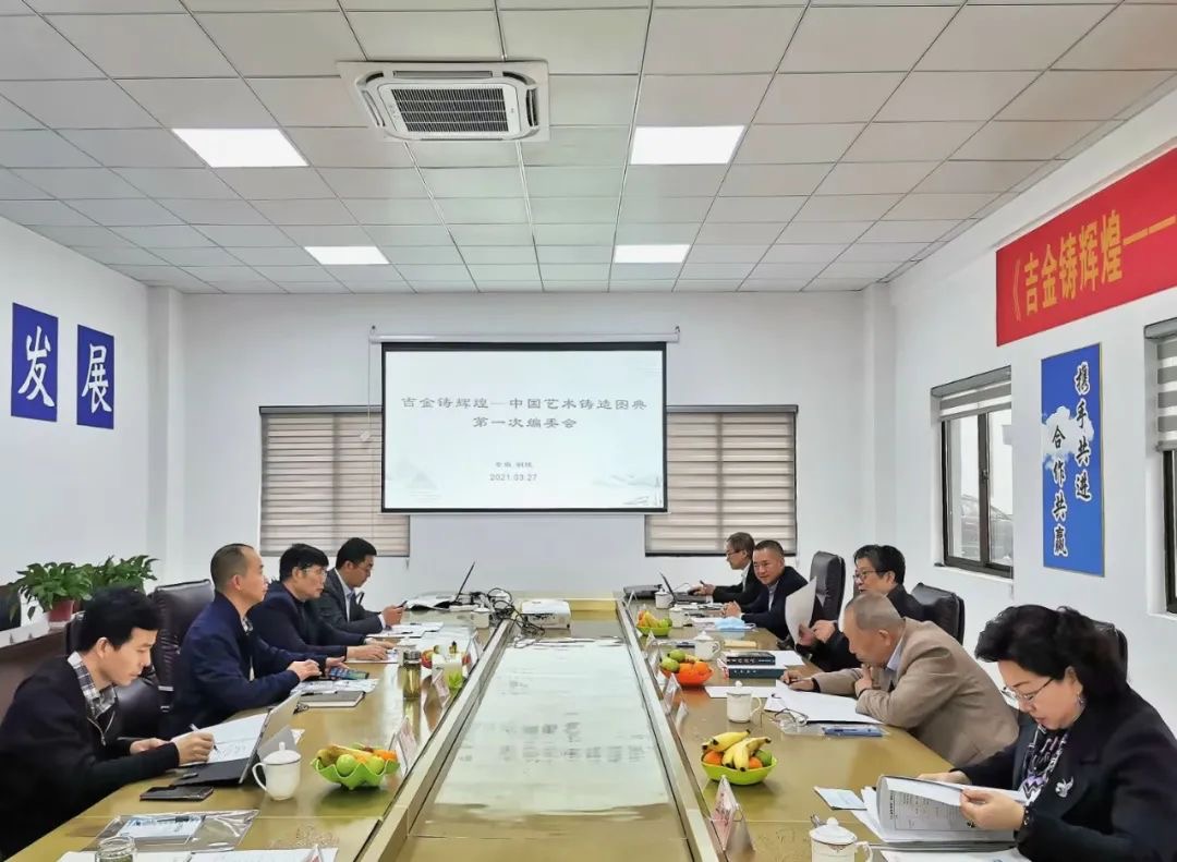 3月26日—3月27日,原中國傳統(tǒng)工藝研究會理事長、中國非物質文化遺產專家委員會委員華覺明先生、上海博物館研究員譚德睿、中國科學技術史學會傳統(tǒng)工藝研究會秘書長王希吟、中國鑄造學會秘書長劉鴻超、《鑄造》雜志社原總編輯葛晨光、廣州美術學院副教授賴錫鴻、中國科技出版社編輯辦公室主任王曉義等一行來公司舉行由中國科學技術史學會傳統(tǒng)工藝研究會、中國鑄造學會、銅陵銅官府文化創(chuàng)意股份公司擬與中國科學技術出版社聯(lián)合出版中英文版著作《吉金鑄輝煌---古今中國藝術鑄造圖典》的第一次編委會會議。